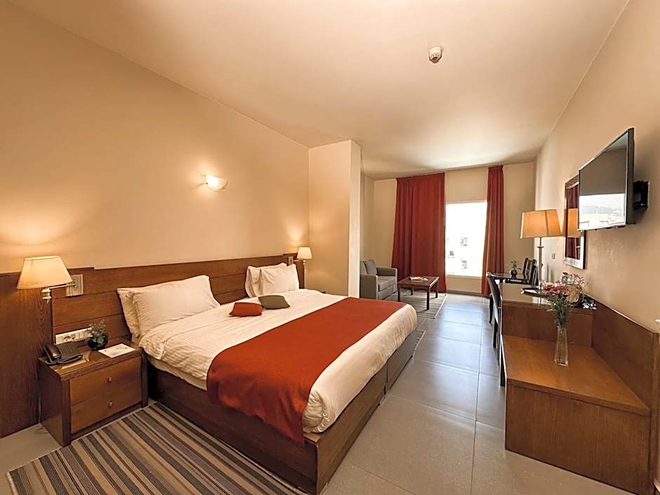 This spacious suite includes a seating area with a sofa. It overlooks the pool and the surrounding gardens. This room type can accomodate 2 Adults and 1 child below 6. An extra bed is available at an added charge.
